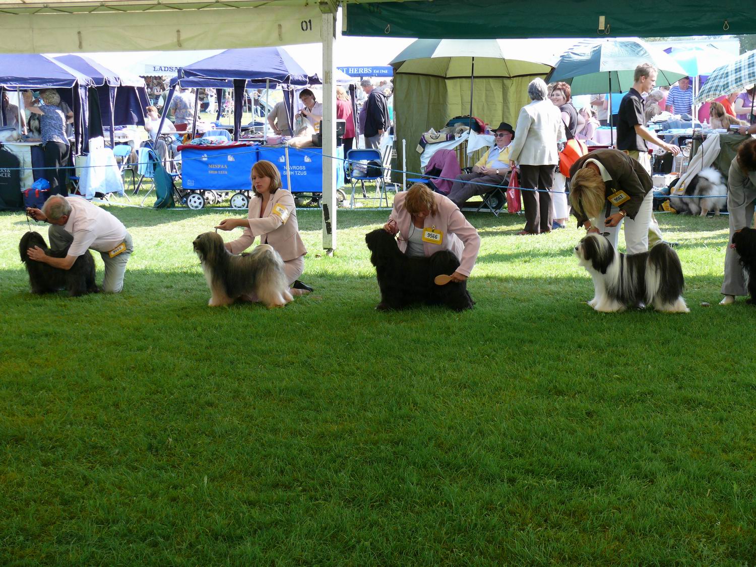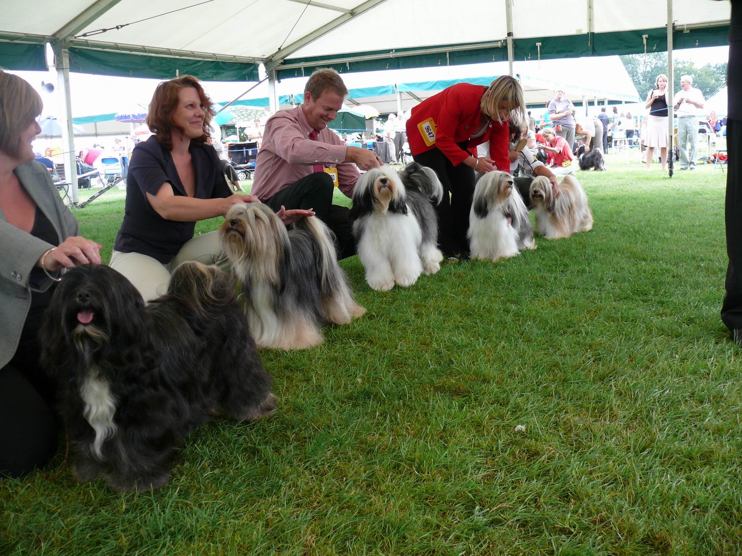 Na dikke twee uurtjes rijden kwamen we aan op de plaats van bestemming. Loseley park was de plaats voor de hondenshow. Een gigantisch kasteelpark waarin gigantische buitententen waren opgesteld voor de hondenshow. Eerst dacht ik dat het een autoshow was, Bentley, Rols, Porsch, Land rovers, enz. stonden gewoon bij mijn auto, ik viel echt op met mijn auto. Eenmaal uitgepakt vervolgde we de weg naar ” de plek waar het ging gebeuren ” en volgens de catalogus was dat ring 18. Op zoek naar de Tibetaanse terriërs. Who, 104 Tibetaanse terriërs waren ingeschreven, zoveel zie je er in Nederland niet over een showperiode van 2 jaar en dan zie je nog dezelfde honden. Nou dat belooft wat deze dag. Eenmaal op plaats van bestemming viel ons meteen op dat de “Gemütlichkeit ” een stuk anders is dan op de shows op het vaste land. De hondenbezitters staan dichter bij elkaar, er wordt elkaar de handen geschud en gekust. Iedereen heeft tijd voor een praatje, pas dan wordt weer aandacht aan de hond geschonken. Voor mij was het de eerste de beste kraam opzoeken waar eten en drinken te koop was. Maar toen trok Glen de koffer open waaruit hij heerlijke broodjes tevoorschijn toverde die rijkelijk belegd waren met eerder bovengenoemde producten, heerlijk. Rond de klok van 10.00 uur begonnen de keuringen. De keurmeester van ring 18 heeft de hele dag Tibetaanse Terriërs gekeurd, de ene nog mooier dan de andere, geweldig. Als we alle honden hadden kunnen kopen die we gewild hadden waren we aan een verhuizing toe. Eenmaal door de keuring aan het lopen en tevens de honden in de catalogus opzoeken komen we toch meerdere malen de naam Talk of the Town tegen, Toplease, Icon en Saved by de Bel zijn enkele namen die meerdere keren in de catalogus terug komen. Toch wel onverstelbaar dat een eenvoudige Tilburgse Zeeuwse vrouw samen met haar man in de loop van jaren lijnen heeft weten uit te zetten die in Engeland in de prijzen vallen en die in dezelfde zin genoemd worden met de winnaar van de Crufts, Sinclair.Glen was deze dag een beetje Michael Boogerd in het wielrennen, hij werd 3 keer derde met zijn honden, waaronder Isabella. Prima prestatie gezien het deelnemersveld.